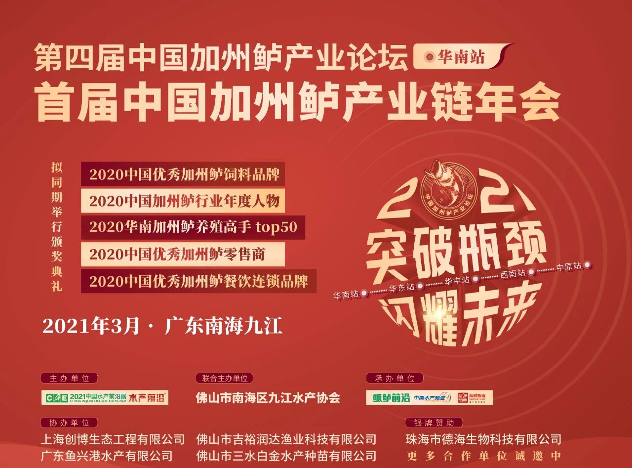2021年3月17日,首届中国加州鲈产业链年会暨第四届中国加州鲈产业论坛系列会议(华南站)在广东·九江雍憬明珠悦宴隆重举行。本次年会由中国水产前沿展、《水产前沿》、佛山市南海区九江水产协会共同举办。《水产前沿》杂志、《鳜鲈前沿》、中国水产频道对中国加州鲈全产业链进行实地走访调研,并组织“2020中国加州鲈行业年度人物”、“中国优秀加州鲈零售商”、“中国优秀加州鲈餐饮连锁品牌”等多项评选活动。